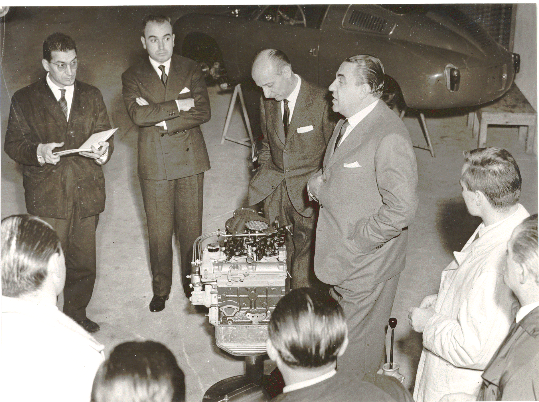 1950 LEFT TO RIGHT, IS AN ENGINEER EMPLOYED IN THE CENTER BY CARLO ABARTH.